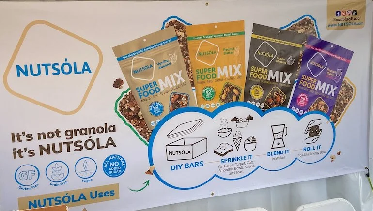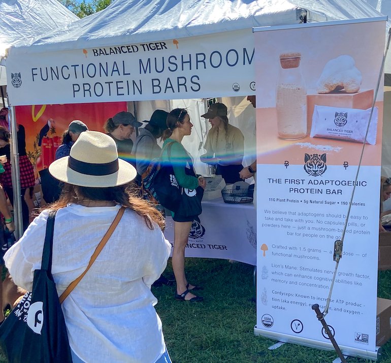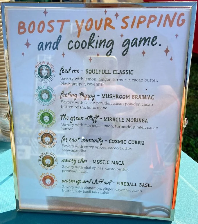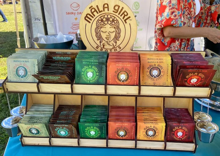 Māla Girl of Orlando, Florida, sells a line of gluten-free, vegan broths that the company calls “magic veggie dust.” I place these broths in my “refreshingly different” category and was pleased to discover them. The broths come in six flavors: Cosmic Curry, Fireball Basil, Miracle Moringa, Mushroom Brainiac, Mystic Maca, and Soulful Classic Broth. All varieties contain cacao butter, Himalayan salt, lemon, celery, dulse, nutritional yeast, and herbs and spices. Each blend then has additional ingredients, respectively: Cosmic Curry (curry spices, ashwagandha, onion), Fireball Basil (tulsi, onion, cinnamon, cayenne, ginger, garlic), Miracle Moringa (moringa, onion, ginger, garlic), Mushroom Brainiac (reishi extract, cacao powder, lion’s mane extract, porcini, garlic), Mystic Maca (cinnamon, cardamom, Peruvian maca, onion, ginger), and Soulful Classic Broth (onion, ginger). Each variety is available in single-serving packets (just add one cup of hot water), with colorful, well-done packaging, as well as eight-serving and 36-serving bags. A serving has between 25 calories and 40 calories depending on the variety. When I think of broth, I think of drinking a savory concoction that is warming and nourishing. I got that vibe when I tried two of the Māla Girl broths. I enjoyed a sample cup of the Soulful Classic Broth—its chicken-less, chicken-like broth—at the company’s tent, and, later on my own, I had a full cup of Mushroom Brainiac—its beef-free, beef-like brown broth. I liked both. The Mushroom Brainiac had a pleasant flavor, but not an overwhelming one. It did not taste mushroomy and I would not have known it contained cacao powder had I not read the list of ingredients. It had tiny chucks in it; maybe they were the dulse and garlic. Regardless, they tasted good. I had a feeling of alertness that kicked in about 15 minutes after drinking my cup of Mushroom Brainiac—a nice sensation of a subtle energy boost. I look forward to trying all the broth varieties. The company’s website states that most of the broths’ individual ingredients are certified organic, but the broths themselves do not carry the U.S. Department of Agriculture’s organic certification.