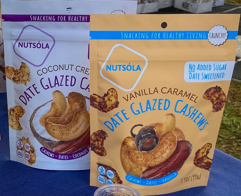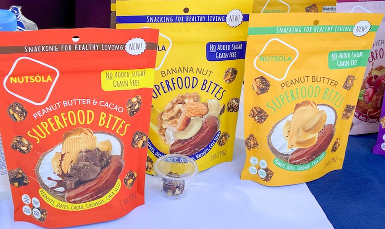 Nutsóla of Livingston, New Jersey, produces gluten-free snacks featuring fruit, nuts, seeds, and spices and sweetened only with dates. “We’re on a mission to improve the food industry by providing delicious products using only clean ingredient, without added sugars,” states the company’s website. Nutsóla offers three lines of snacks: Superfood Bites, Superfood Mixes, and Date-Glazed Cashews. The Superfood Bites caught my eye. There are seven varieties, each available in 3.5-ounce bags: Banana Nut, Cacao Almond, Cherry Max, Peanut Butter, Peanut Butter & Cacao, Peanut Butter & Jelly, and Vanilla Almond. I enjoyed a bag of the Peanut Butter & Cacao mix (ingredients: dates, peanuts, peanut butter, cacao, chia seeds, coconut, vanilla extract, cinnamon, sea salt). I found this snack—more specifically, these little square-shaped bites—to be fresh-tasting, quite flavorful, not too sweet, and not dry or hard. There was a nice balance between the peanut and cacao flavors. I also liked that the bites did not leave gunk on my hands. As a result, I could see myself throwing a bag of Superfood Bites in a backpack for on-the-go noshing, even on an airplane or train. The Superfood Mixes come in eight varieties, each in eight-ounce bags: the same seven as the Superfood Bites and then the seasonal Pumpkin Spice blend. The mixes have the same ingredients as the Superfood Bites, but are loose blends, not formed into square bites. The Date-Glazed Cashews are Nutsóla’s newest offerings. They come in two blends, each in 3.5-ounce bags: Coconut Cream (ingredients: cashews, dates, coconut, sea salt) and Vanilla Caramel (cashews, dates, vanilla extract, cinnamon, seal salt). I hope Nutsóla’s owners will consider incorporating organic ingredients into these snacks. That would make these already-worthy products even better in my book.