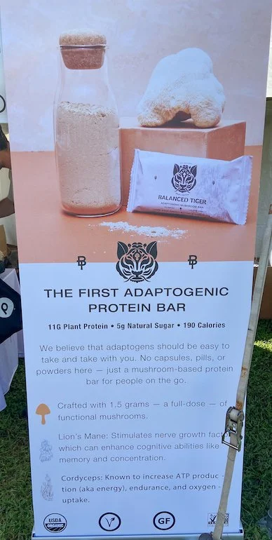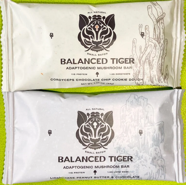 Balanced Tiger of Miami is a new business that has brought to market organic, gluten-free protein bars that contain “functional” mushrooms, in this case cordyceps and lion’s mane. I have taken lion’s mane in supplements for years to boost my cognitive performance, and I have used cordyceps at times to bolster my stamina. Thus, I was pleased to run across these bars. Balanced Tiger calls them “a remedy to modern imbalance.” The bars come in two varieties: Energy (chocolate chip cookie dough—and almonds—with cordyceps) and Focus (peanut butter and chocolate with lion’s mane). Cordyceps is “recognized for the ability to support endurance and sustain energy,” while lion’s mane is “recognized for the ability to support focus and productivity,” states the Energy and Focus bars’ respective wrappers. Each bar’s main ingredients include tapioca (cassava) syrup, brown rice protein, pea protein, chocolate chips, diced almonds or peanuts, sorghum flakes, sea salt, and sunflower lecithin. Each bar weighs 44 grams, including 11 grams of protein, five grams of sugar, and 1.5 grams of the respective mushroom, and has 190 calories. I liked both varieties, but I preferred the Focus bar, as I tend towards peanuts/peanut butter and chocolate more so than cookie dough. Neither type had an overpowering rich taste, but rather a more-subtle clean taste that was not overly sweet. There was no discernible mushroom taste. The bars were easy to chew and went down easily. One minor point: The Focus bar didn’t taste like peanut butter to me. Instead, it came across as peanutty with the chocolate. That’s not a bad thing; it was just different to my palette. I verified with Balanced Tiger Co-founder Jackson Gorman that the bars are certified organic with the US Department of Agriculture and that the department’s organic seal will appear henceforth on the wrappers of forthcoming batches. Also of note, Balanced Tiger’s website states that the company’s goal is to “have 100-percent compostable packaging—wrappers and all—by the end of 2022.”